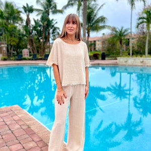 Ecru Organic Cotton Women’s Lounge set, Cozy Home Wear, Luxury Lounge wear, 2 pieces lounge wear set