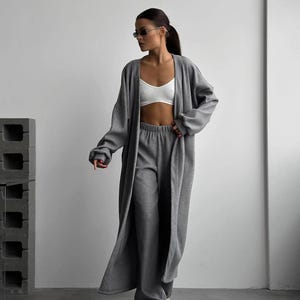 Elegant Cardigan and Pants Set, Women’s Rib Knit Outfit, Cozy Loungewear, Soft Knit Set, Grey Milk Colors